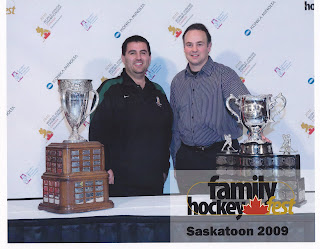 Day one of the Family Fest in Saskatoon brought some mixed crowds and some happy hockey people. I arrived early to check it out, not very many people, but lots to do. There were skills competitions for the kids; accuracy, rapid fire shooting and mini games hockey games. They had old Team Canada games on the big screen and NHL 2010 for the Xbox and Wii for people to play. The Hockey Hall of Fame have a few items setup, those pictures will be posted as soon as I can get them uploaded. Lots of Gretzky, Lemieux, Crosby and the coolest thing I have seen in a long time, Paul Henderson's goal stick. More of that to come. In the far corner, I was pleasantly surprised by the setup, there were memorabilia auctions and trophies set up for people to view. The Memorial Cup, RBC Cup, ART ROSS and Calder Trophies were all there for people to view take pictures of get their pictures taken and printed on the spot, proceeds going to the Children's Hospital. Hawerchuk was scheduled to be there at 6:00 but as most hockey people, was a few minutes late. We spotted him wandering around looking at the displays. Hey, can't knock a guy for that. They set him up by the trophies, with a catch, For $10 you could get a picture with Dale and the trophies he won, the Calder and Memorial. Hey, that's a unique experience even for this hockey freak. They printed the pics out and Dale signed them. I managed to get a #0 signed, a Jets puck and a blank puck. I asked him to personalize the number and I got his HOF year and All the Best. I think that is a cool request, and players seem to add more for you too. The next day was Dennis Hull. Mr. Hull, I mean Dennis (he gave me heck for calling him Mr. Hull) signed for about 30 people, more of an older crowd too. I got 2 pucks, 1 Black Hawk and 1 blank plus a white #1. I got my picture with him taken by Gary Peters, 1965-66 Stanley Cup Champion with the Montreal Candiens. That's kinda cool to have a Cup winner take your picture. I also got Gary on a black puck, he put the Cup year and Canadiens name. Dennis was very cool, signed lots and had some good visits with people. The third day was suppose to be Hayley Wickenheiser, hockey godess in these parts. Withthe best female hockey player in the world signing today, it was not hard to get my wife to come down with me. But when we got there, we found out Haley hurt her back and was not able to attend. Oh-oh, my wife was a little ticked but not much you could do and with the Olympics around the corner, Haley take care of that back, please...Kim St-Pierre came in her place, Kim of course is the Team Canada goalie for the upcoming games in February. She signed my Team Canada jersey and puck, and my wife for her Team Canada puck signed. We both got pictures with her and walked off. There was a First Nations hockey booth set up near so we walked over to have a look. Craig McCallum of the Prince Albert Raiders (WHL) was signing, so I managed to get a blank puck signed. They had jerseys and cards set up of First Nations NHL current and former NHL players. Rich Pilon, Jim Neilson and Freddie Sasakamoose all had some and gone from the booth but I missed them. Today at 1:00, all the guys with Reggie Leach will be at the booth so that is today's task. More to come, its just getting started!